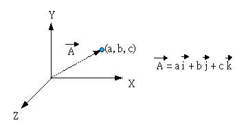 A向量為由原點出發、具有大小與方向性的向量,大小即為原點至該點的長度,而方向即為圖中箭頭所表示的;當向量長度為1時,我們稱為「單位向量」,通常使用i, j, k來表示X軸、Y軸與Z軸的單位向量,而向量的表示法,可以使用上圖右式所示。