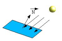 向量內積在圖學上的應用之一,就是求得光線的照射量,我們必須先知道,與平面垂直的向量為平面的法向量,如果有一平行光源照射至某平面,則我們可以藉由平 面法向量與光源的向量求內積,如果內積為零,則表示光源與平面平行,則平面受光量為0,內積求得值的絕對值越大,則平面受光量越大。