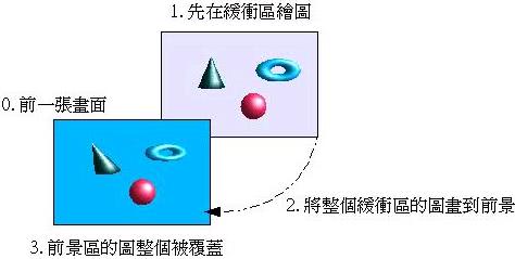 這時候可使用雙緩衝區(double-buffer)的方法,要準備兩個繪圖物件,其中一個是前景區,也就是您所看到的畫面,另一個繪圖物件您看不到,在 畫面準備好之前,所有的圖形先繪製在您看不到的畫面,當所有的圖形都繪製完畢,再將所有的圖形繪製到前景,此時前景會整個被後繪圖區所覆蓋,完成一次畫面 的播放,下圖為簡單的示意圖: