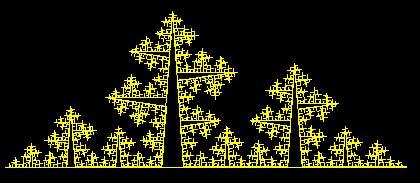 接下來只要在主幹與支幹上不斷的繪製一定比例的相同圖形,就可以完成一顆樹,將這些樹排列起來就成為樹林,詳細的原始碼請看以下的程式,其中註解部份先不 用理會: