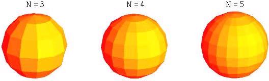 看似複雜的水晶球,其實只要有一個規則可以輕易的求出每一個頂點,我們先使用一個圓球,然後用XY平面的橫剖面說明,在XY象限的90度中 若只有一個平面,則訂N為1,每個象限依此處理,此時可以定出四個頂點,然後將這四個頂點以旋轉體來處理,從XZ象限來訂出旋轉角度,N等於1時必須 以90度旋轉四次,使用此方法所畫出的是一個八面體,如下所示: