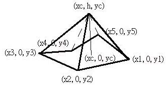 錐狀體將底面所有的頂點放置在XZ平面上,底面與錐頂點的交點為(xc, 0, yc),高度為h,則錐頂點的座標為(xc, h, yc),如下所示: